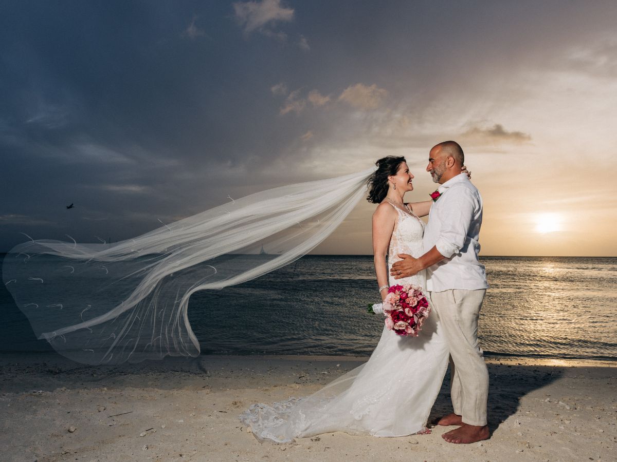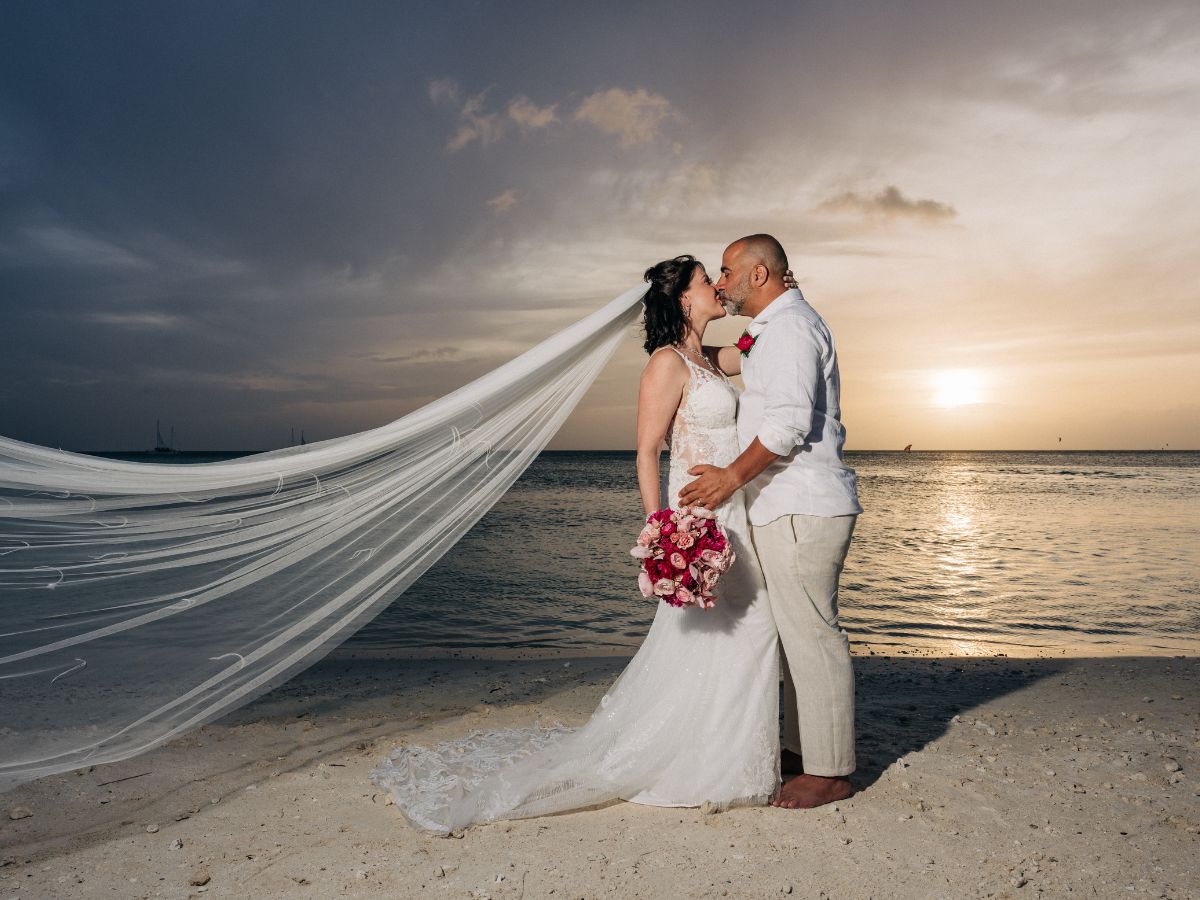When it was time for portraits, Kerry and John took advantage of Aruba’s breathtaking golden hour on the beach. The sun dipped low, casting a warm, flattering light and painting the sky with hues of orange and pink. We captured everything from intimate close-ups to sweeping shots of the couple against the endless ocean backdrop. If you’re dreaming of a beach wedding in Aruba, I can’t recommend scheduling your portraits around sunset enough—it’s simply magic.