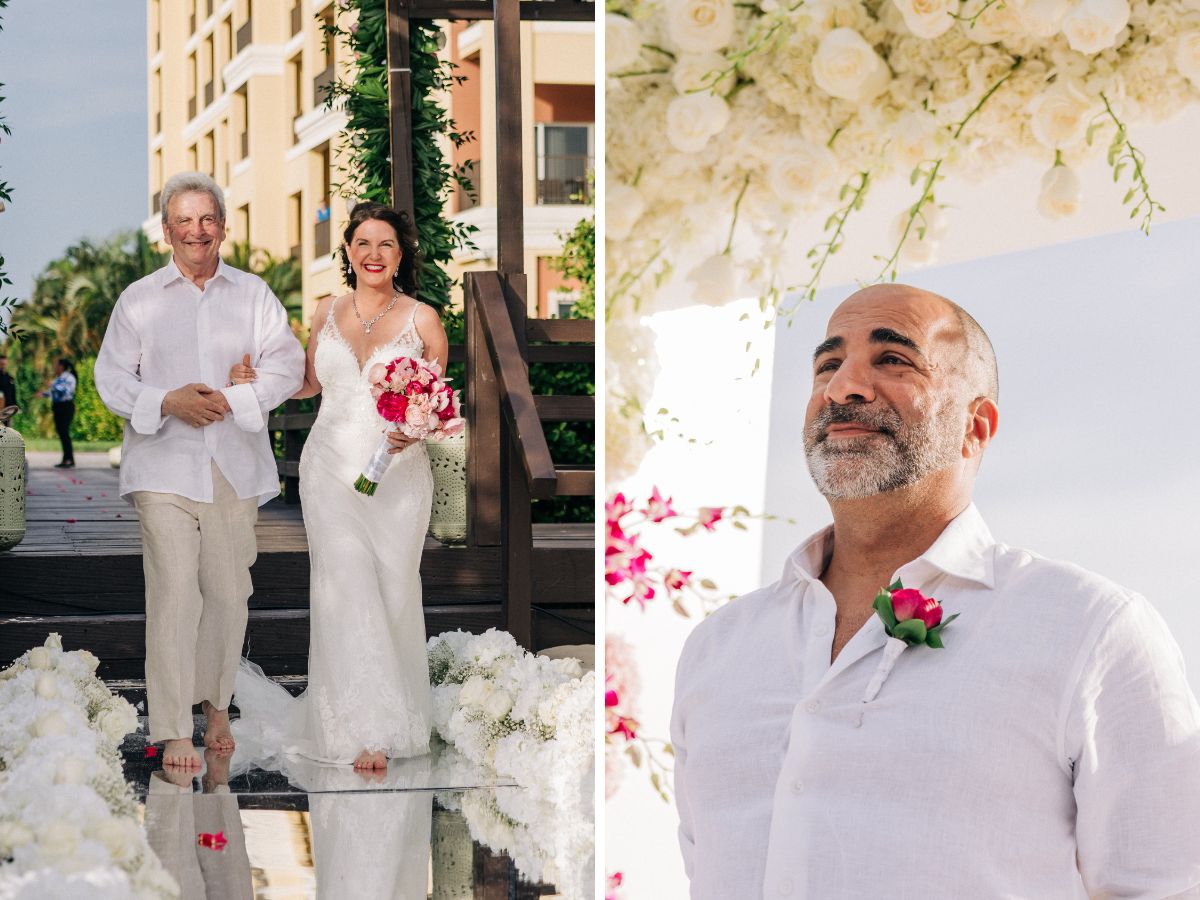 Unlike many couples who opt for a dramatic first look, Kerry and John chose to get ready together—a sweet choice that set the tone for the day. The ceremony took place at the stunning Infinity Bridge, a spot that offers panoramic views of the ocean and sky meeting on the horizon. The decor was elegant yet fresh, with lush florals courtesy of the talented team at Bee4Aruba adding soft touches of pink and white that echoed the natural beauty surrounding us. Watching Kerry and John exchange vows there felt like witnessing a private moment between two souls completely in sync—right there on the edge of the Caribbean Sea.