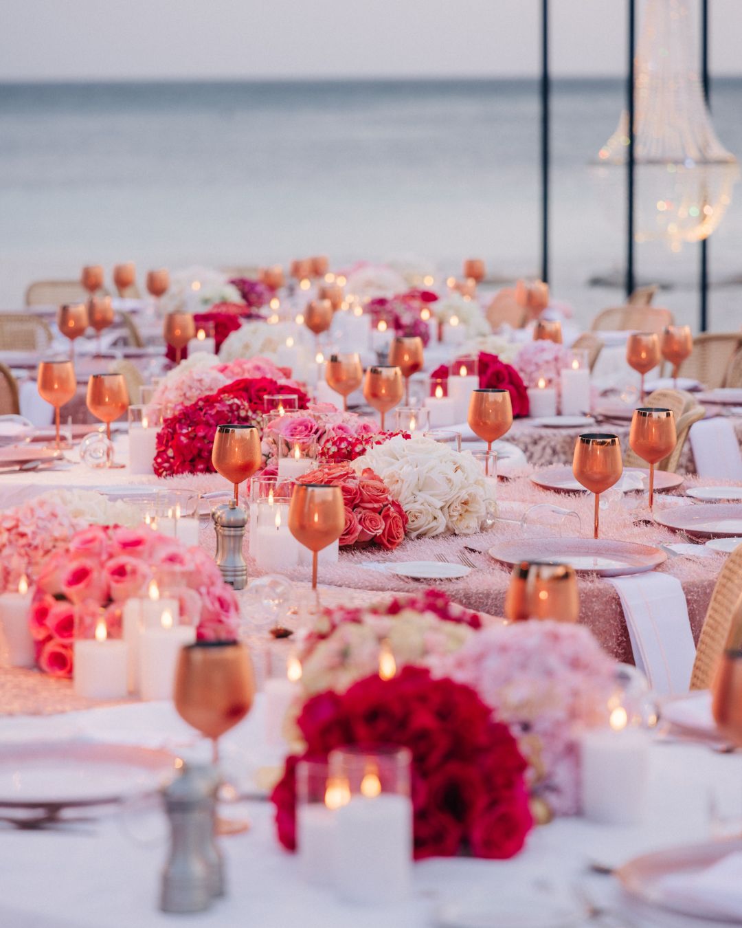 For couples craving a more delicate vibe, blush-toned florals, rose gold accents, and softly draped linens create an ethereal seaside setting. Add candlelight and the sound of waves, and you have a reception that feels like a dream brought to life. (Want to capture those magical moments before the ceremony? Read my First Look Guide for inspiration.)