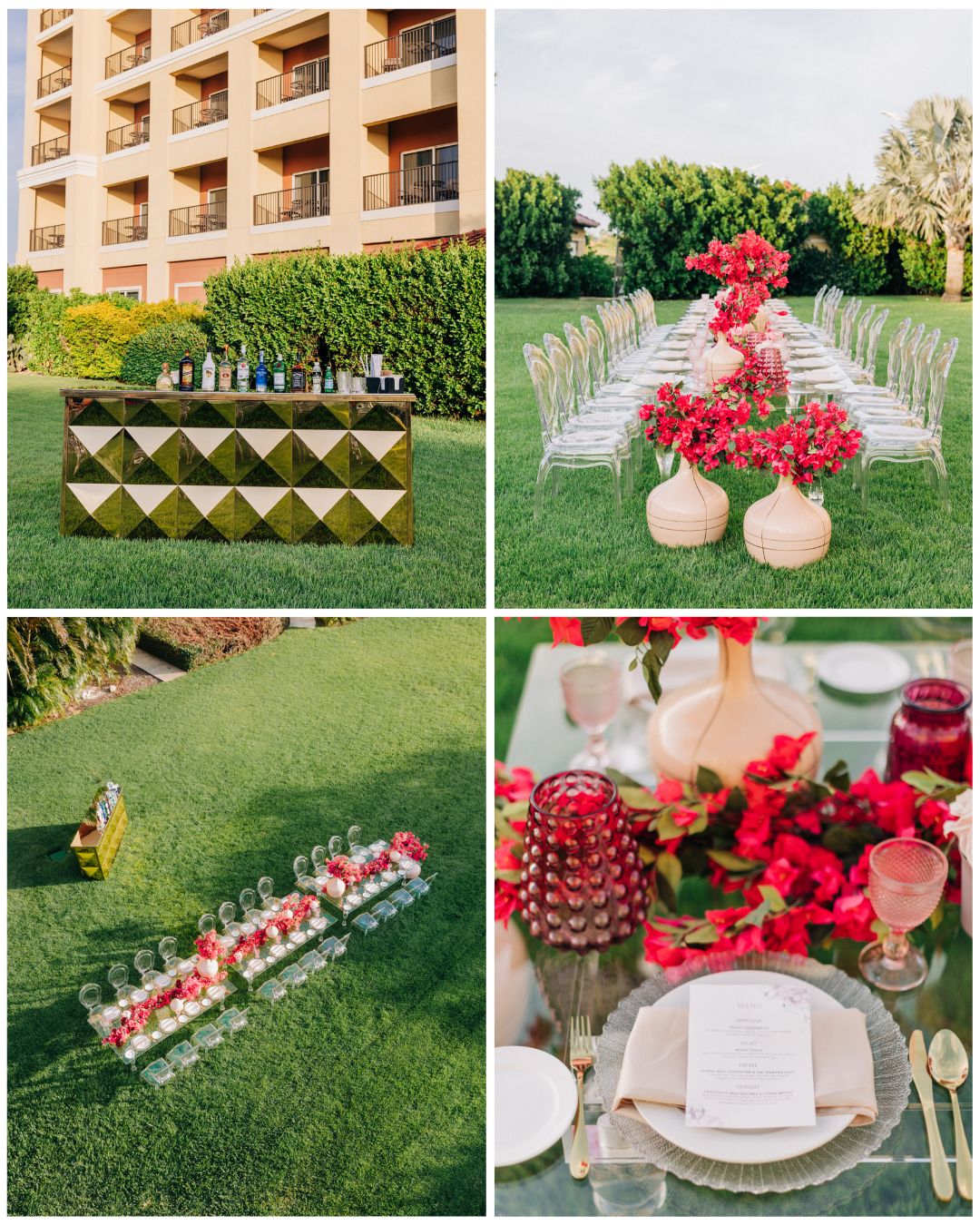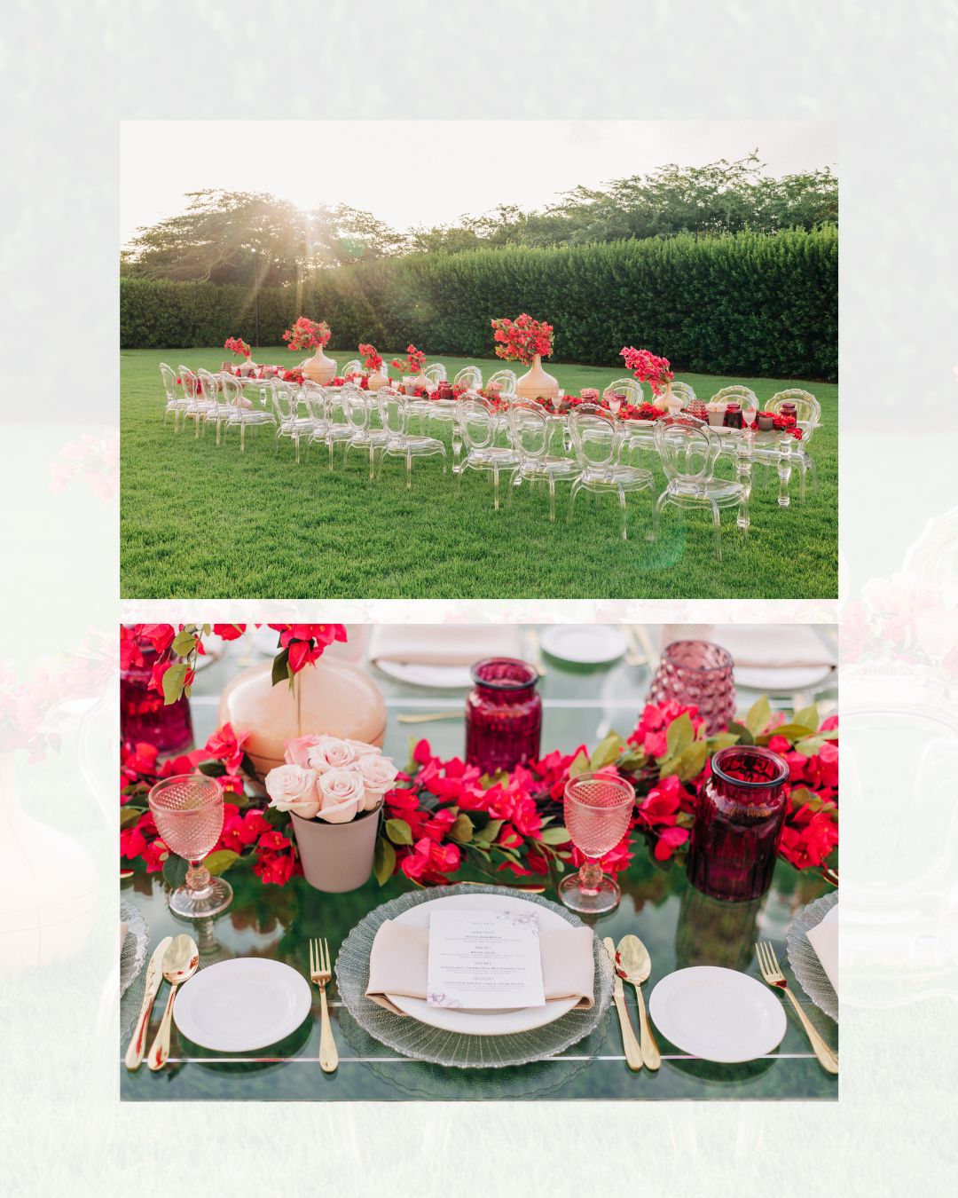 If bold colors and modern design are your love language, you’ll fall for the Red Sculpting’s reception style. Lush pink bougainvillea, sleek ghost chairs, and mirrored tables create a dramatic, high-fashion feel. It’s perfect for couples who want their Aruba wedding reception to be both stylish and unforgettable. (Tip: Ask your planner how to incorporate custom lighting for an even more striking atmosphere.)
