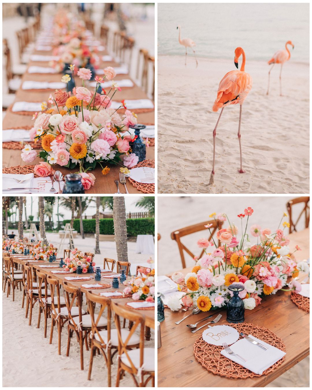 Few places can compete with the magic of Renaissance Private Island—especially Flamingo Island, where your reception can unfold just steps away from Aruba’s famous pink flamingos. Colorful floral arrangements, woven chargers, and turquoise water views make it one of the most unique reception experiences for weddings in Aruba.